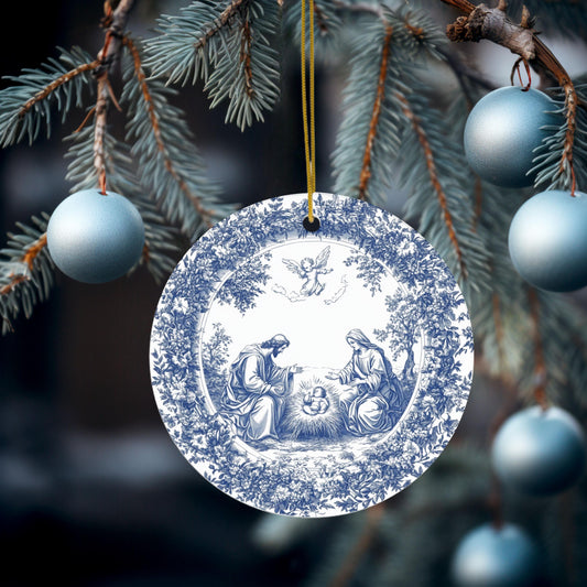 Christian Ornament, Nativity Blue Toile de Jouy Christmas Ornament, Catholic Ornament, Nativity of Jesus Ornament Ceramic Christmas Keepsake