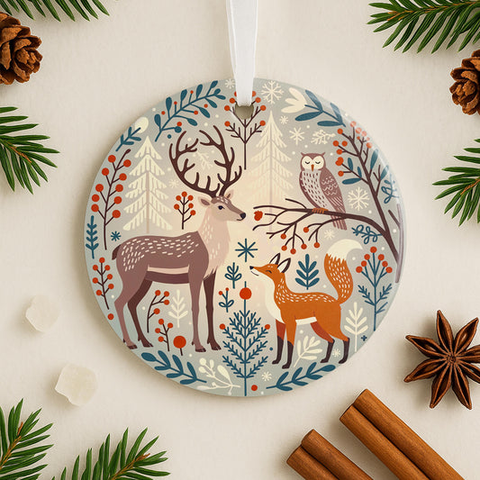 Nordic Woodland Animals Ornament Scandinavian Winter Forest Deer Fox Owl Scene Holiday Gift Ceramic Tree Decor in Swedish Folk Style