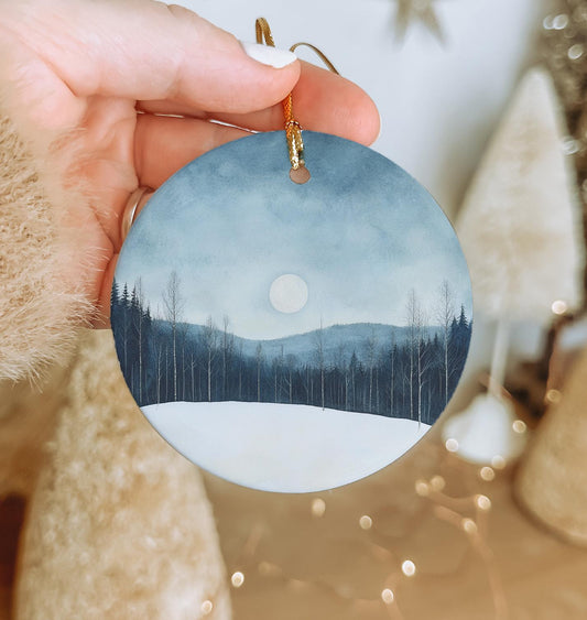 Serene Snowfield Moonlight Watercolor Painting, Ceramic Ornament, Full Moon Decor, Winter Landscape Art, Circular Design Ornament
