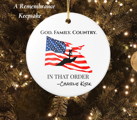 God Family Country Memorial Ornament, Charlie Kirk Patriotic Quote, American Flag and Cross Ceramic Keepsake, Faith Remembrance Gift