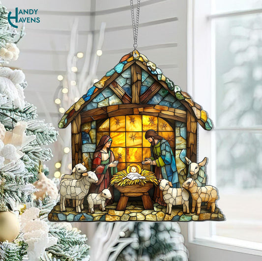 Nativity Holy Family Acrylic Suncatcher, Rustic Stable Faux Stained Glass Window Hanging, Christian Christmas Decor Gift