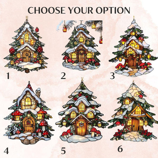 Christmas Tree Acrylic Suncatcher, Cozy Winter Cottage Faux Stained Acrylic Window Hanging Gift Holiday Cottage