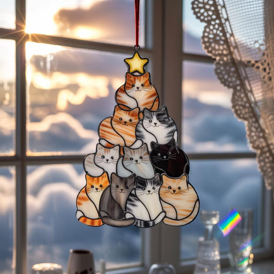 Cat Christmas Tree Acrylic Hanging Suncatcher – Stacked Kitty Holiday Window Decor, Star Top Stained Glass Sun Catcher, Gift for Cat Lovers
