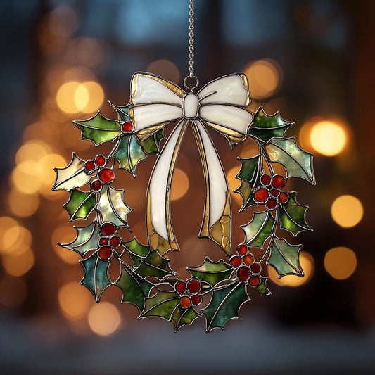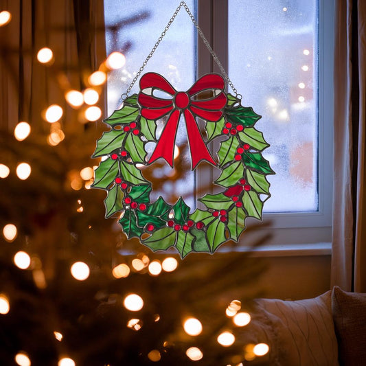 Christmas Holly Wreath Acrylic Suncatcher | Festive Holiday Stained Glass Window Hanging | Holly Wreath ornament | Christmas gift, THT